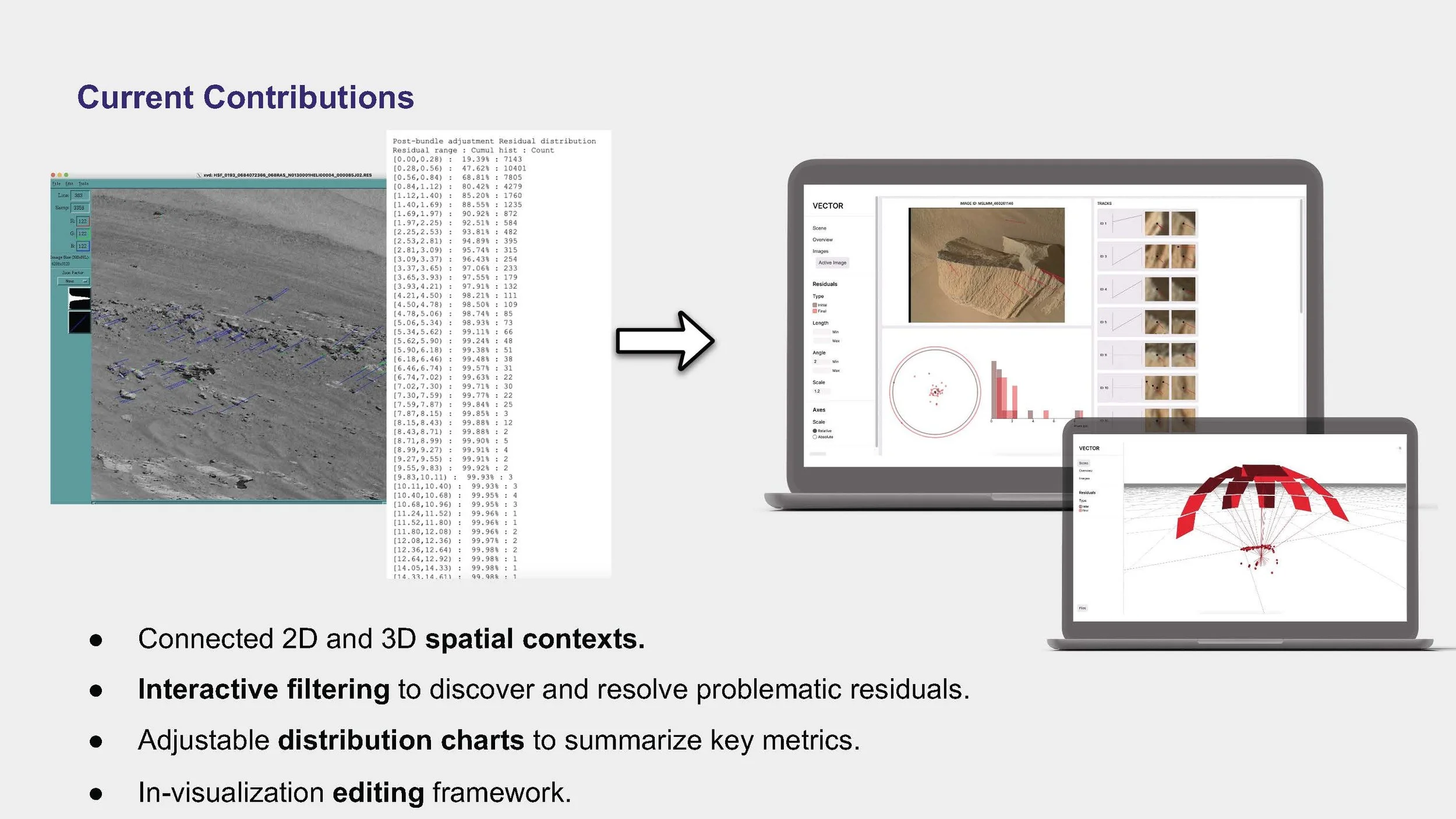 SLAM scientists need ways to quickly parse through hundreds of images with thousands of tiepoints that are used to create 3D mesh constructions of the surface of Mars. These scientists need to be able to find and remove images that are low quality, edit incorrect tiepoints, and adjust incorrectly interpreted camera positions.